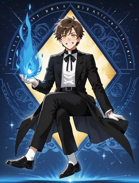brown hair, yellow eyes