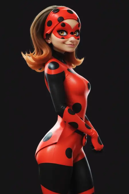 Scarabella Prompts : 1girl, bodysuit, polka dot, mask, domino mask, brown hair, red hair, superhero, gloves, brown eyes, yellow eyes, dark-skinned female, turtleneck, flipped hair, earrings, skin tight