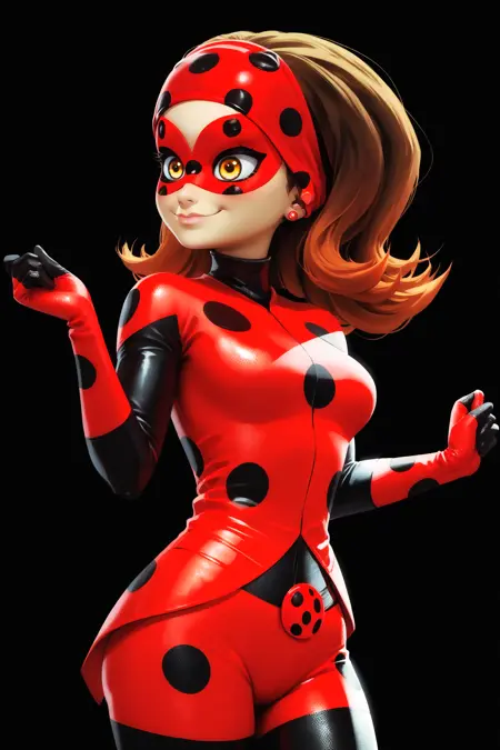 Scarabella 提示词:1girl, bodysuit, polka dot, mask, domino mask, brown hair, red hair, superhero, gloves, brown eyes, yellow eyes, dark-skinned female, turtleneck, flipped hair, earrings, skin tight