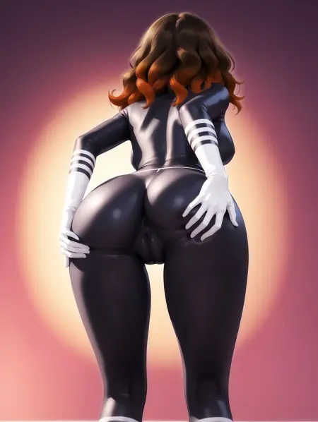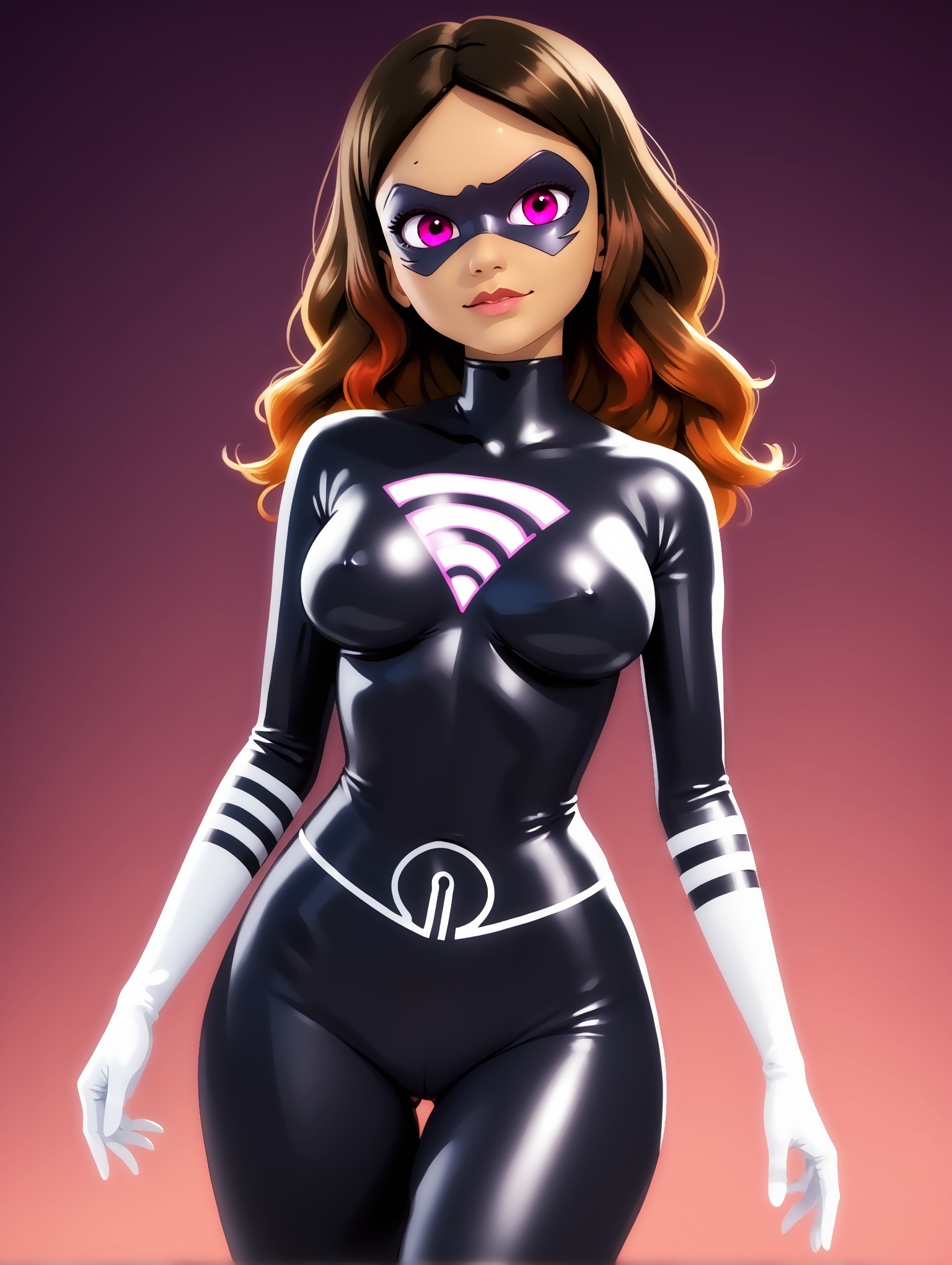Lady Wifi 提示词:1girl, bodysuit, black bodysuit, mask, domino mask, gloves, brown hair, gradient hair, two-tone hair, large breast, dark skin, dark-skinned female, superhero, white gloves, purple eyes, skin tight, wide hips