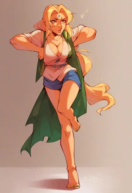 このモデルは、顔の表情としてrolling_eyesとparted_lipsと組み合わせるとよく機能し、素足にすることでポーズの重みが全体的に増すようです。