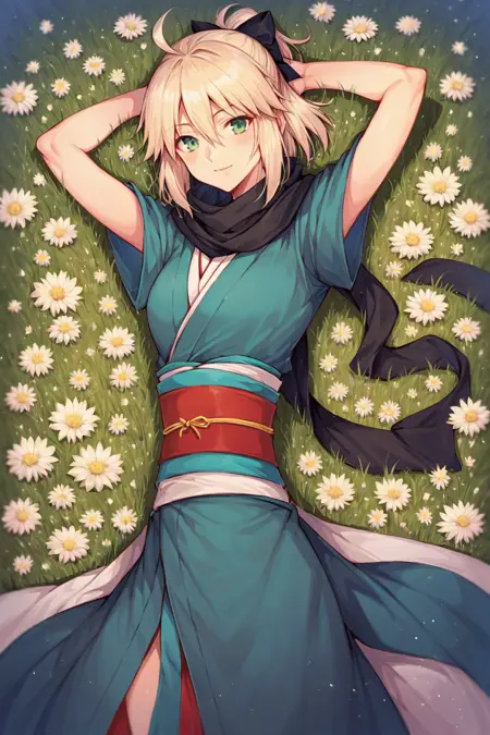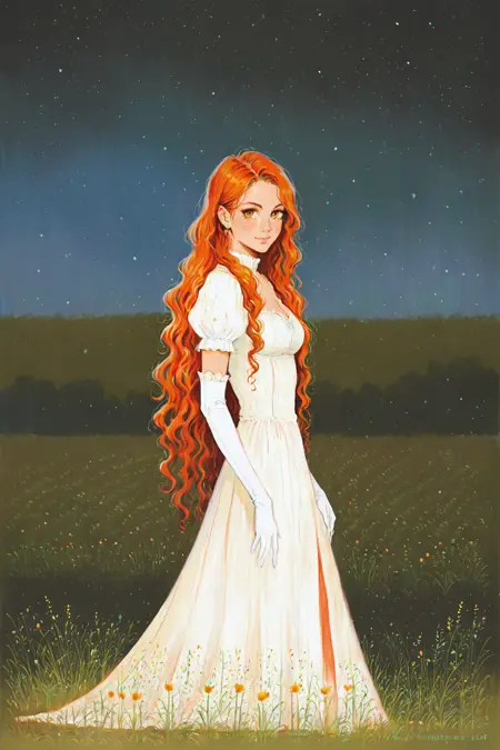 prompt for x/y: score_9, score_8_up, score_7_up, rating_safe, 1girl, solo, long hair, curly hair, wavy hair, orange hair, orange eyes, looking at viewer, breasts, dress, white dress, puffy sleeves, puffy short sleeves, short sleeves, gloves, elbow gloves, white gloves, cowboy shot, closed mouth, standing, outdoors, field, flower, grass, plant, sky, lora:choo:LORA