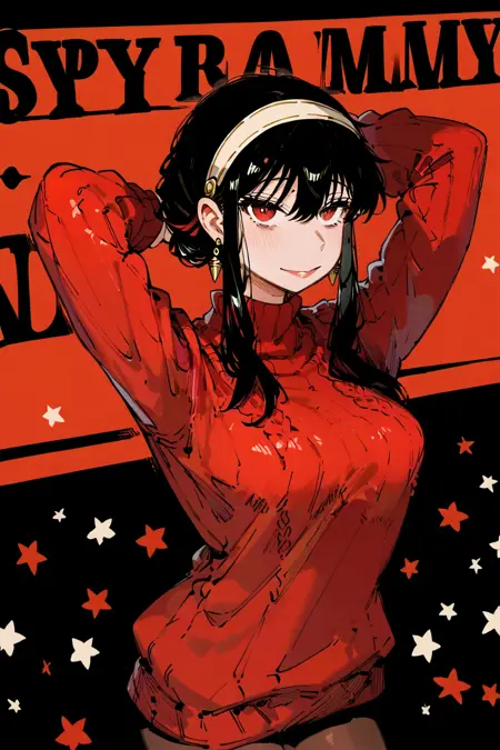 prompt for x/y: score_9, score_8_up, score_7_up, 1girl, spy x family, yor briar, black hair, brown pantyhose, earrings, hairband, red eyes, red sweater, sweater, solo, solo focus, portrait, simple background BREAK p65fn lora:ruffct:LORA