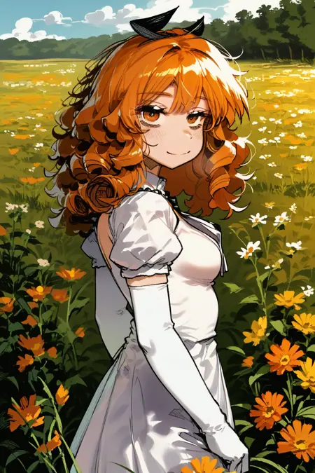 prompt for x/y: score_9, score_8_up, score_7_up, rating_safe, 1girl, solo, long hair, curly hair, wavy hair, orange hair, orange eyes, looking at viewer, breasts, dress, white dress, puffy sleeves, puffy short sleeves, short sleeves, gloves, elbow gloves, white gloves, cowboy shot, closed mouth, standing, outdoors, field, flower, grass, plant, sky, lora:choo:LORA