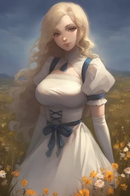 x/y 提示词:score_9, score_8_up, score_7_up, rating_safe, 1girl, solo, long hair, curly hair, wavy hair, orange hair, orange eyes, looking at viewer, breasts, dress, white dress, puffy sleeves, puffy short sleeves, short sleeves, gloves, elbow gloves, white gloves, cowboy shot, closed mouth, standing, outdoors, field, flower, grass, plant, sky, lora:choo:LORA