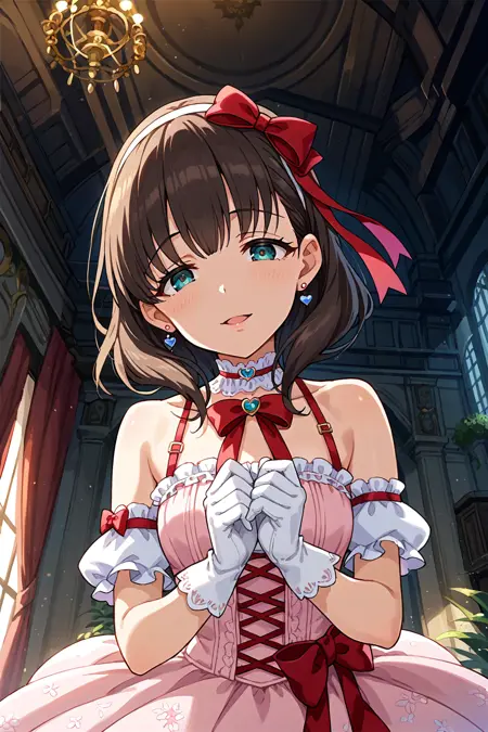 ドレスバージョン: ドレス、ジュエリー、手袋、イヤリング、リボン、ヘアバンド、視線を観客に向けている、ピンクのドレス、裸の肩、ボウ、ハート、白い手袋、チョーカー、赤いリボン、髪のリボン、靴下