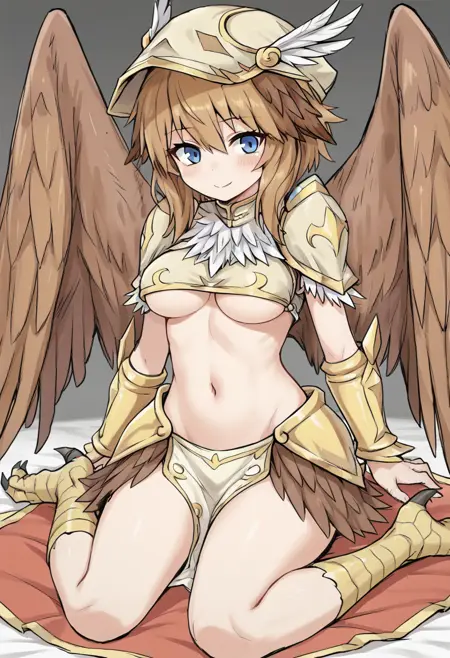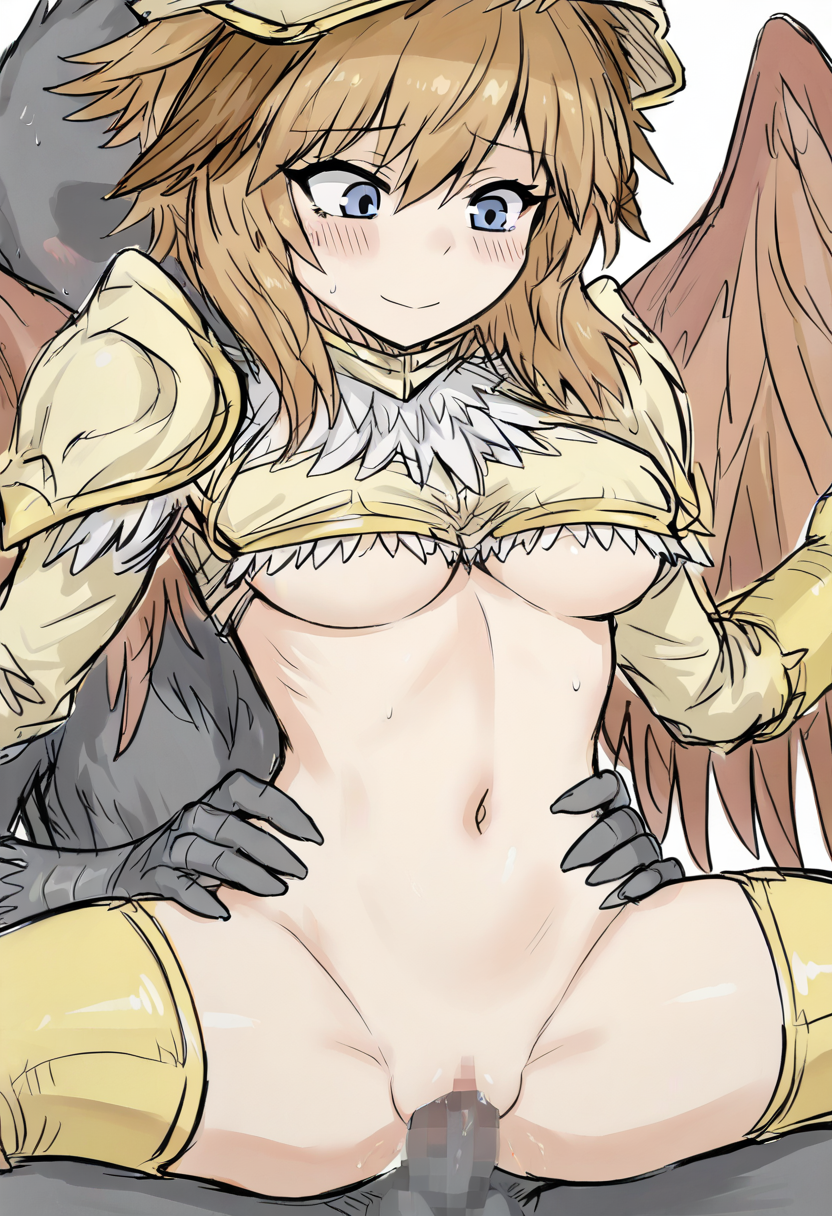 griffybs2, 1girl, solo, medium breasts, blue eyes, wings, winged arms, brown wings, breasts, brown hair, monster girl,