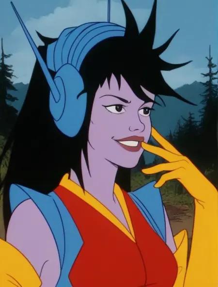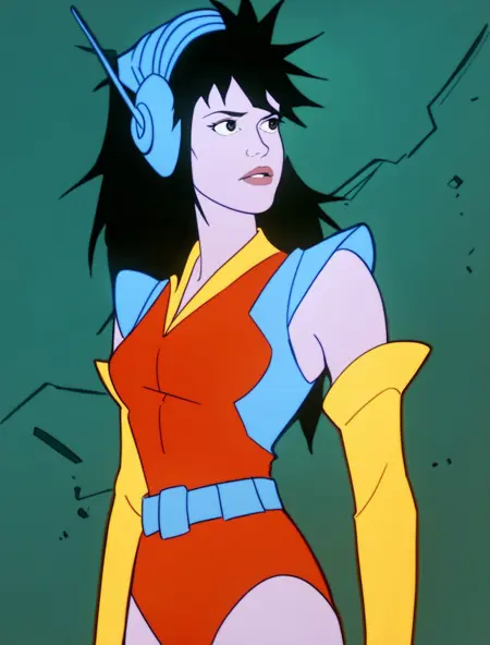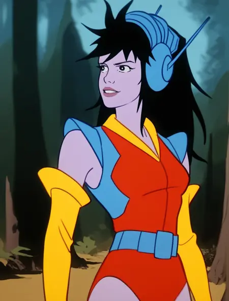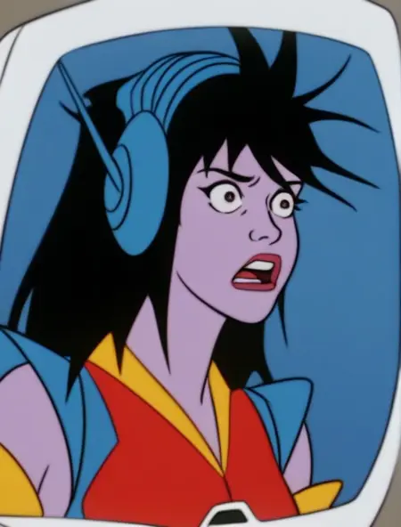 보라색 피부, 어두운 눈, 길고 어수선한 머리카락, 검은 머리카락, 파란 헤드셋, 미소, 빨간 미래형 레오타드, 파란 어깨 패드, 노란 고무 장갑, 벨트, 신발 등등.