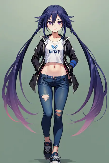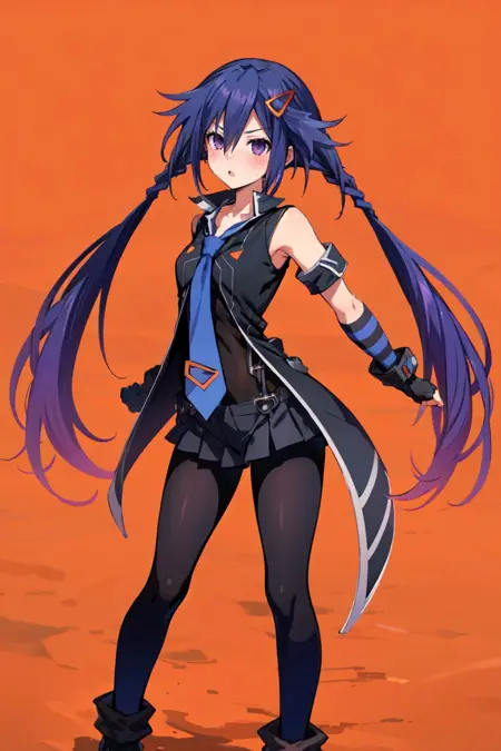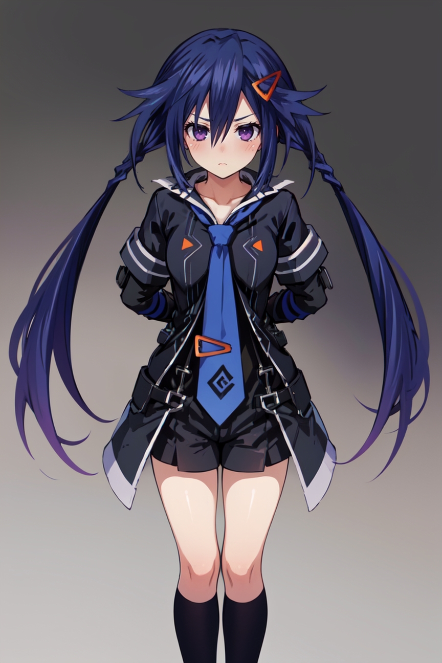 그녀를 소환하려면 다음 트리거 태그에 아래 태그를 추가하세요: solo, long hair, hair ornament, hairclip, blue hair, purple eyes, looking at viewer, twintails, twin braids, necktie, blush, braid, breasts