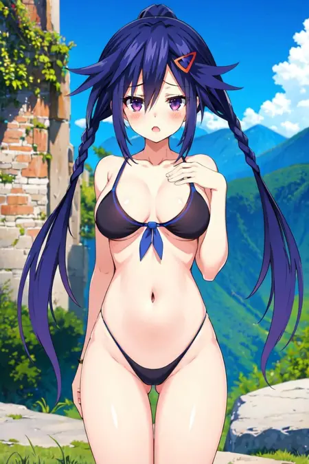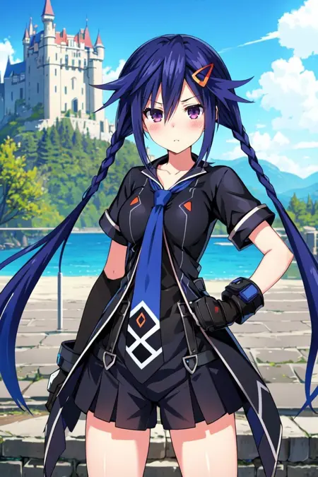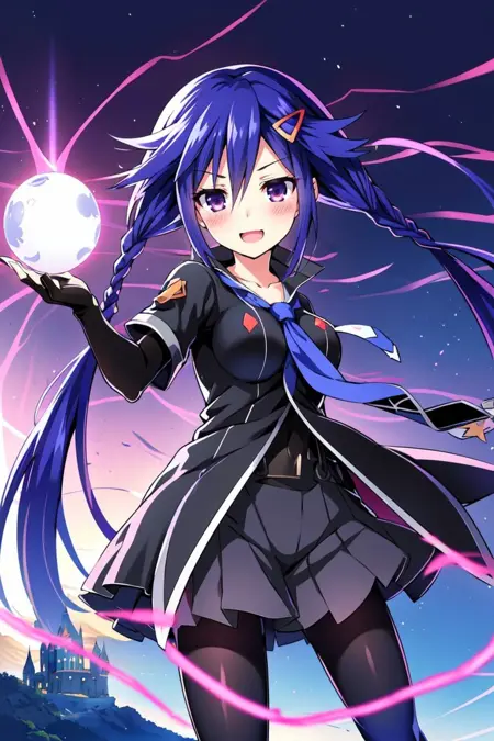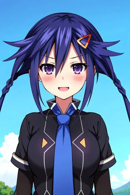 • To summon her use the trigger Tags plus following tags: solo, long hair, hair ornament, hairclip, blue hair, purple eyes, looking at viewer, twintails, twin braids, necktie, blush, braid, breasts