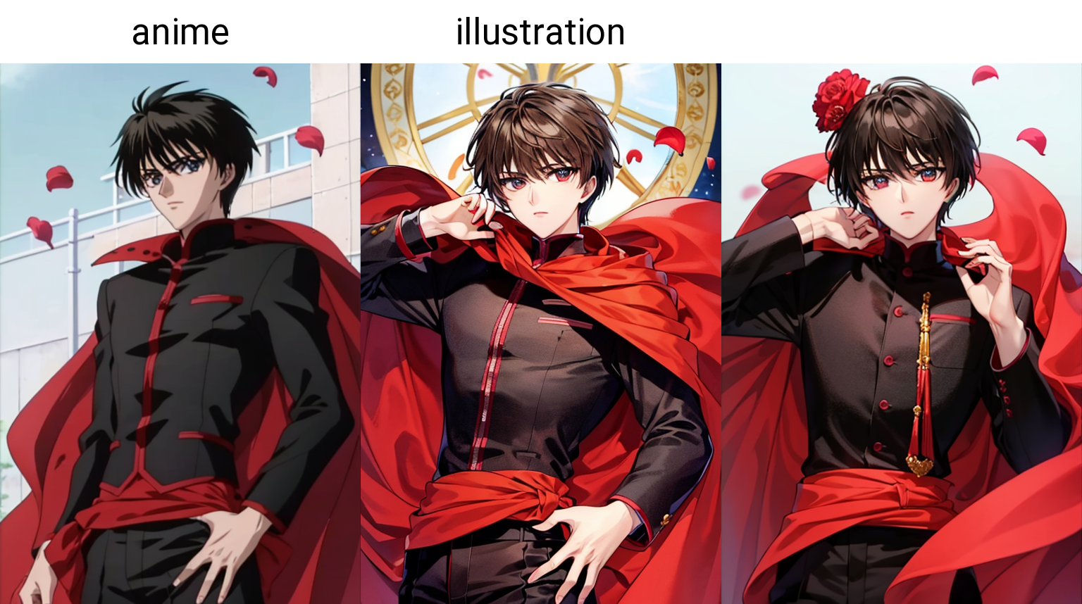 最後に、彼には「スタイル」が二種類あります。animeillustrationです。animeは彼にMad Houseシリーズのような雰囲気を与え、illustrationは漫画からの昔のCLAMP風イラストを模倣しています。ギャラリーに例を置いてあります。