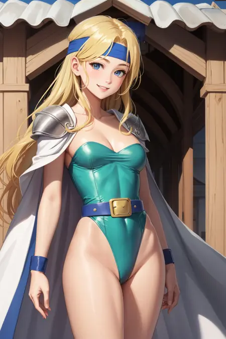 添加“蓝色头带,绿色紧身衣,白色披风,蓝色腰带,蓝色手镯,白色过膝袜,蓝色靴子”以呈现她游戏中的造型。