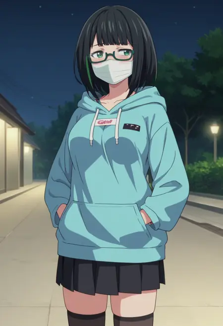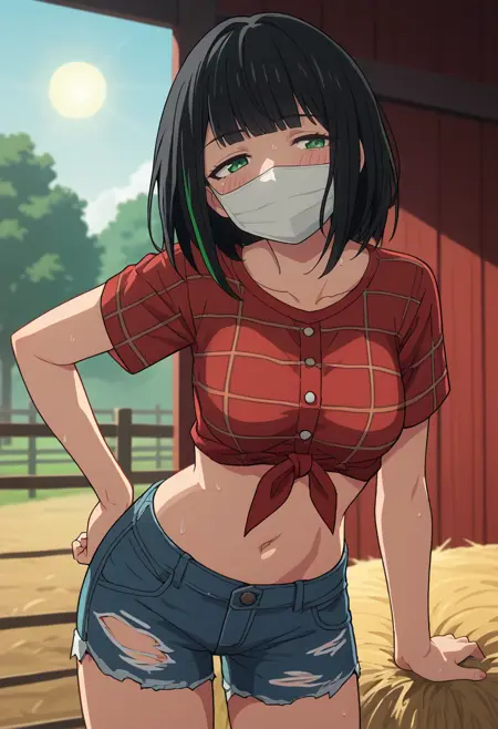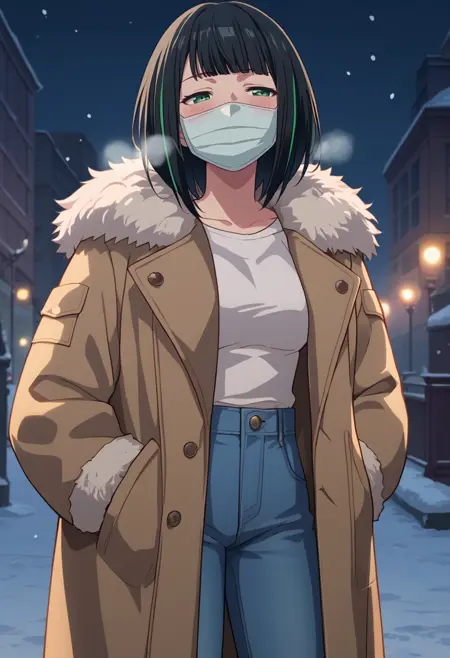 트리거: KJOHass, 검은 머리, 스트라이프 머리, 단정한 앞머리, 녹색 눈, 미디엄 헤어, 마스크, 반달린 눈