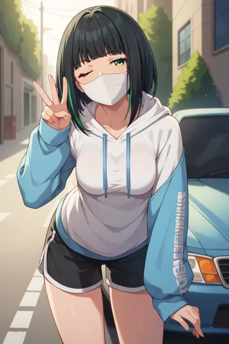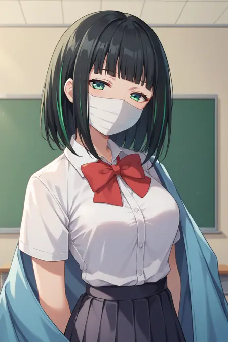 트리거: KJOHass, 검은 머리, 스트라이프 머리, 단정한 앞머리, 녹색 눈, 미디엄 헤어, 마스크, 반달린 눈
