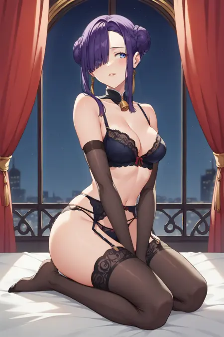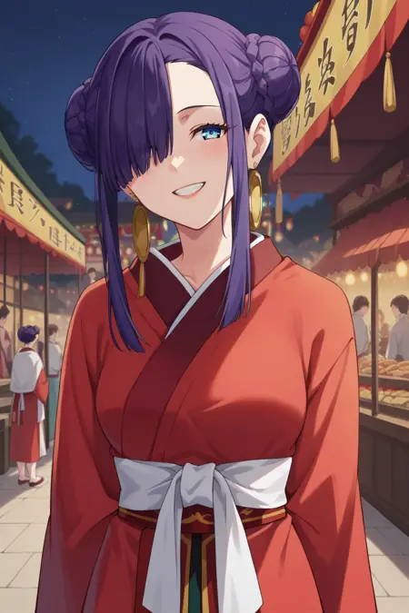 KJOhime, purple hair, blue eyes, asymmetrical bangs, hair over eye, sidelocks, double bun,