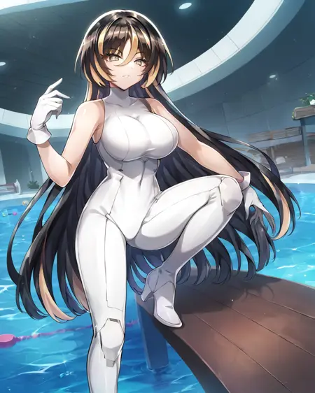 ホワイトボディスーツ、袖なし、ホワイト手袋、ハイヒールブーツ、ホワイトブーツ、