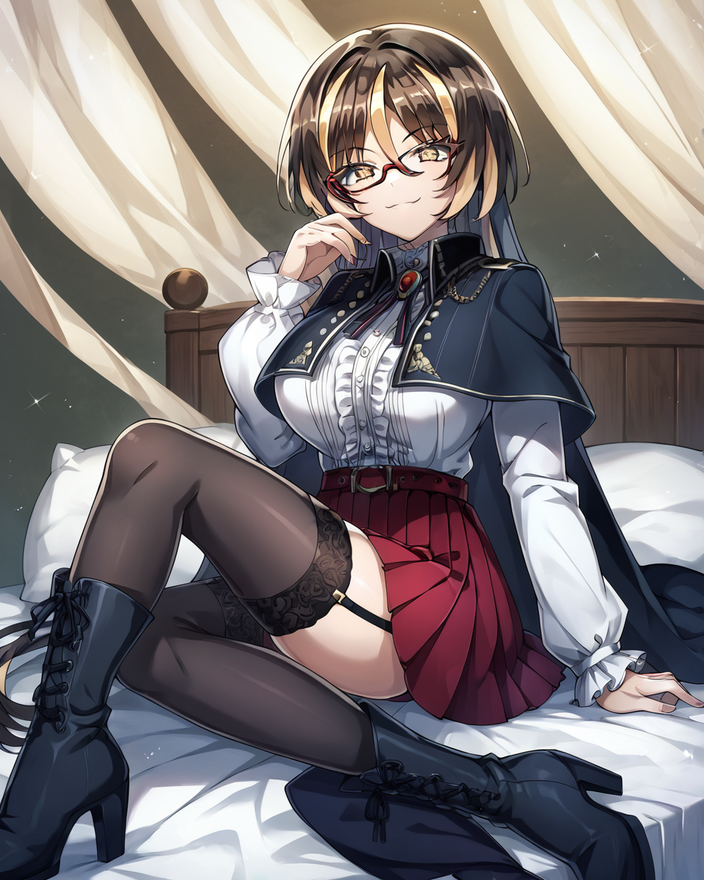 赤枠の眼鏡、アンダーリム眼鏡、キャップ、ブラックキャプリット、白シャツ、長袖、中央のフリル、ジュエリー、ブローチ、ベルト、赤スカート、プリーツスカート、赤ショートパンツ、ガーターストラップ、ブラックタイツ、ハイヒールブーツ、レースアップブーツ、