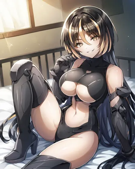 ブラックレオタード、アンダーブストカットアウト、腹部カットアウト、ブラック肘手袋、ハイヒールブーツ、シンボーツ、