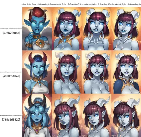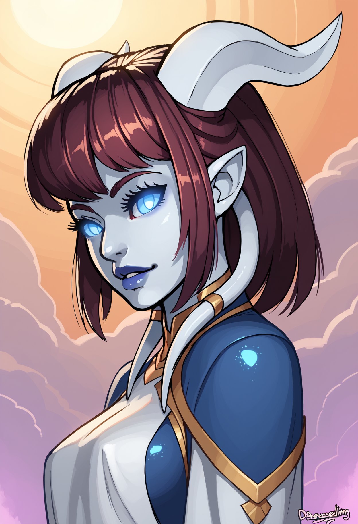 より正確にしたい場合は、以下を使用してください:monara, grey skin, blue eyes, glowing eyes, horns, hooves, elbow gloves, thighhighs