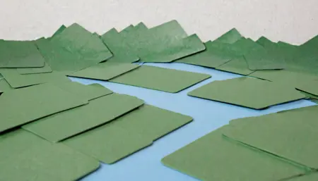 plastkort, a forest shaped (made from:1.3) single light blue and dark blue colored (rectangular plastic cards), lora:Plastkort-000005:1