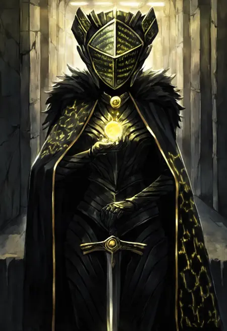 BinahArmor, futuristic armor, full armor, black armor, helmet, gold trim, black cape, open cape