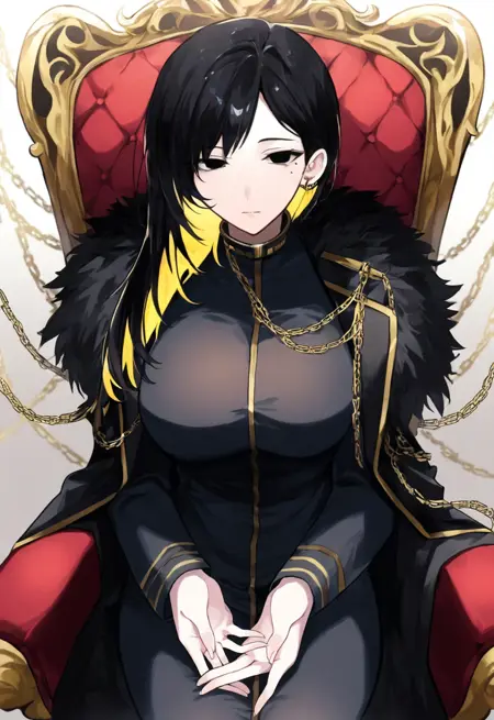 BinahLOR, black dress, yellow ascot, black pants, black footwear, black coat, open coat, fur trim