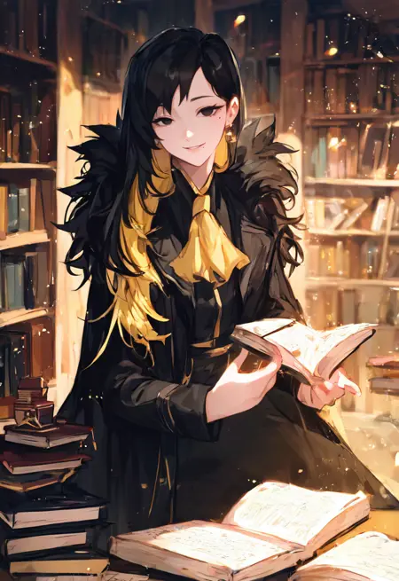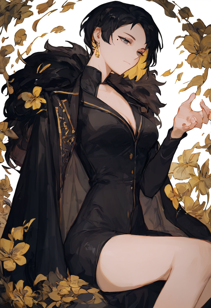BinahLOR, black dress, yellow ascot, black pants, black footwear, black coat, open coat, fur trim