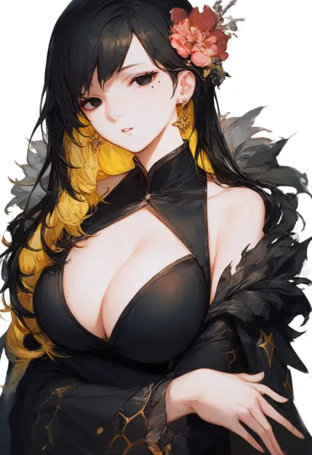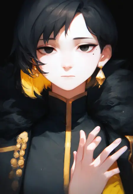 multicolored hair, black hair, yellow hair, black eyes, short hair