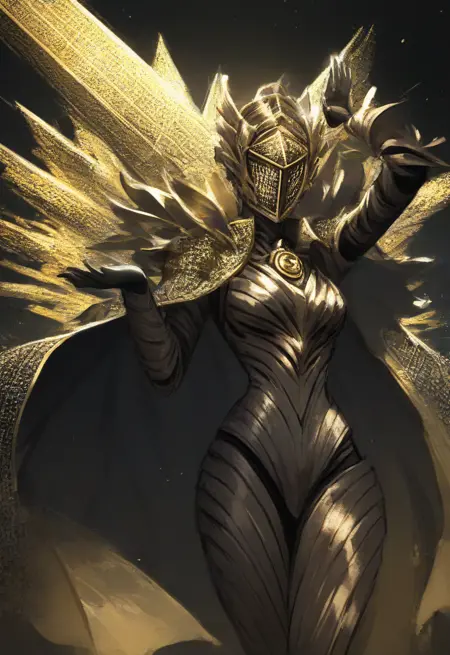 BinahArmor, futuristic armor, full armor, black armor, helmet, gold trim, black cape, open cape