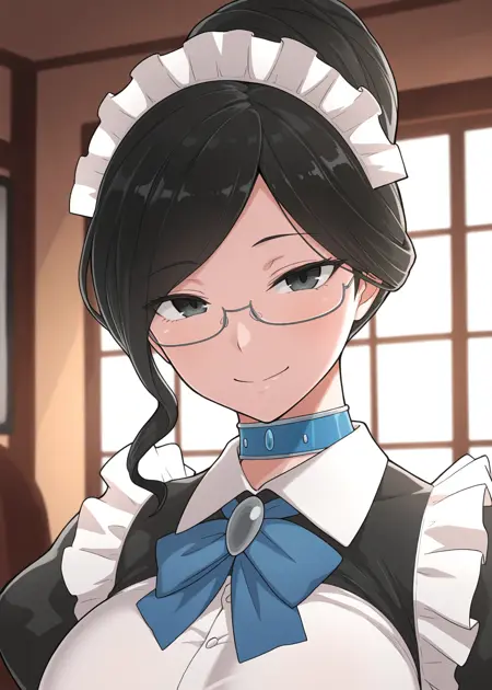 女仆:yurialphamaid, white_maid_headdress, rimless_eyewear, blue_choker, blue_bowtie, puffy_long_sleeves, wrist_cuffs, blue_sash, white_maid_apron, long_maid_apron, long_skirt