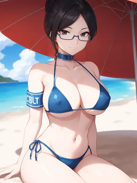 외형 태그: yurialpha, black_hair, grey_eyes, single_hair_bun, hair_bun, blue_choker