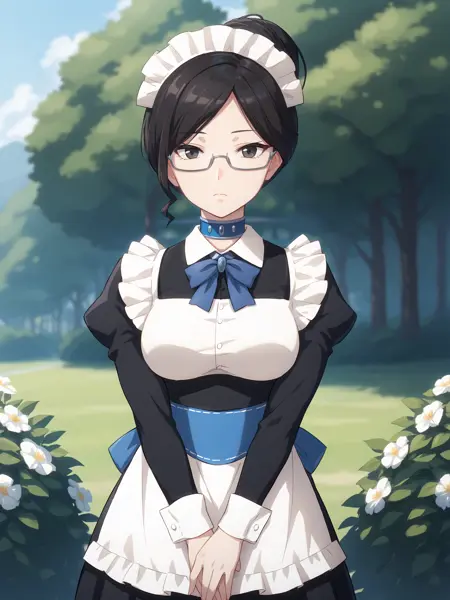메이드: yurialphamaid, white_maid_headdress, rimless_eyewear, blue_choker, blue_bowtie, puffy_long_sleeves, wrist_cuffs, blue_sash, white_maid_apron, long_maid_apron, long_skirt