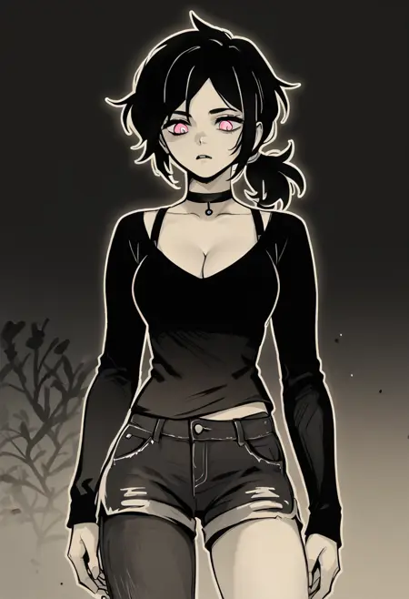 ashleygrav43es, 1girl, solo, breasts, black hair, ponytail, pink eyes, limited palette,