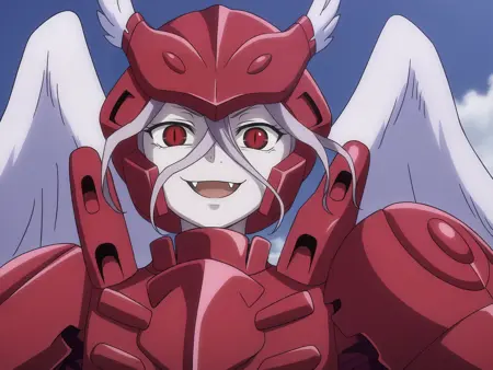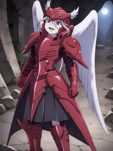 动力装甲服装:红色动力装甲、全身盔甲、长裙、百褶裙,Shalltear_Bloodfallen,红色头盔,带翼头盔,白色羽毛,红色肩甲,红色胸甲,红色护手,红色胫甲,天使之翼,白色翅膀,羽毛翅膀,红色装甲靴,及膝靴,高跟鞋,女武神