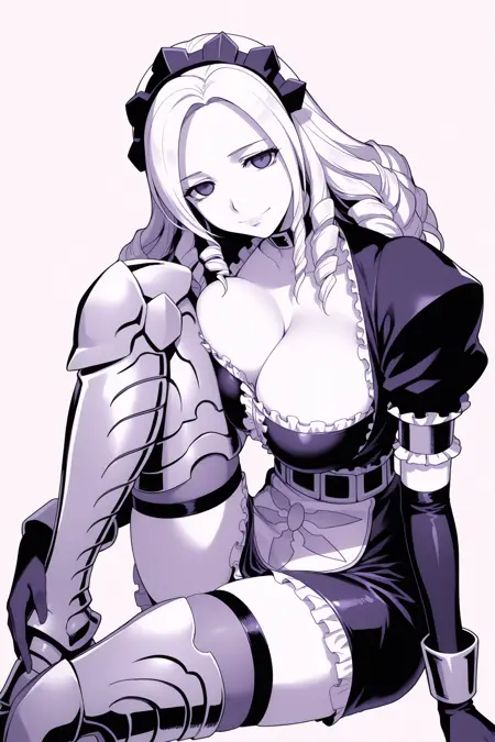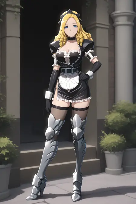 메이드(갑옷): solution_Black_maid_uniform, solutionepsilon, black_maid_headdress, black_collar, puffy_short_sleeves, elbow_gloves, black_gloves, wrist_cuffs, belt, white_maid_apron, print_maid_apron, frilled_skirt, black_miniskirt, black_thighhighs, side_slit, greaves, armored_boots, high_heels, thigh_boots
