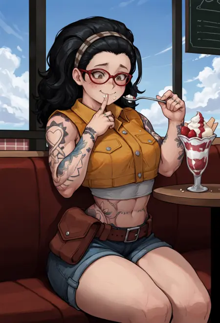 她的“机械师服装”:OutfitMch,黄色背心,短款上衣,腰包,多功能腰带,牛仔短裤,超短裤,靴子,棕色鞋履,无袖 + 她的纹身:肩部纹身、手臂纹身、手部纹身、腹部纹身,腿部纹身,根据画面构图而定