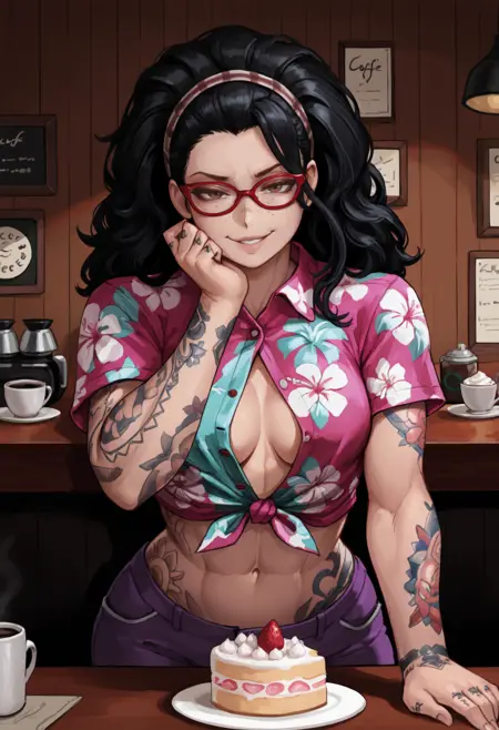 “整体外观/基础信息”:Ncltt,黑发,长发,棕色眼睛,眼镜,红框眼镜,格子发带,雀斑 + 她的纹身:肩部纹身、手臂纹身、手部纹身、腹部纹身、腿部纹身,根据画面构图而定