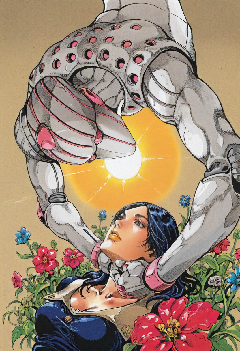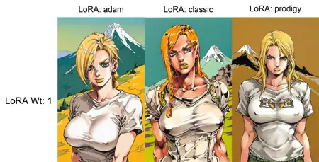 卓越的 版本 LORA 在 20 幅荒木飞吕彦的作品上进行了训练,以保留其原始画作的风格,而非动漫改编风格。不幸的是,即使训练步数很少,它仍然出现了过拟合。因此,我不建议使用高于 3 的 CFG 值——超过这个值在我看来已经过于刺眼,偏离了原始意图。