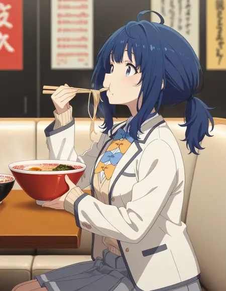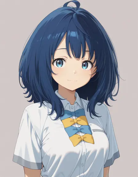 <lora:anna_yanami-makeine_s1-ixl-anime-soralz:1>, anna yanami (makeine), 蓝色头发,中长发,呆毛,蓝眼睛,马尾,黄色发圈