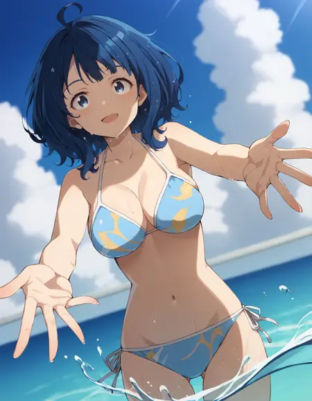 泳装,锁骨,胸部,蓝色比基尼,印花比基尼,肚脐,侧系绳比基尼下装,凉鞋