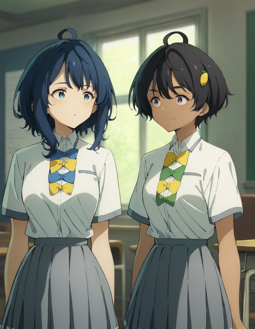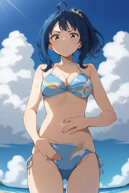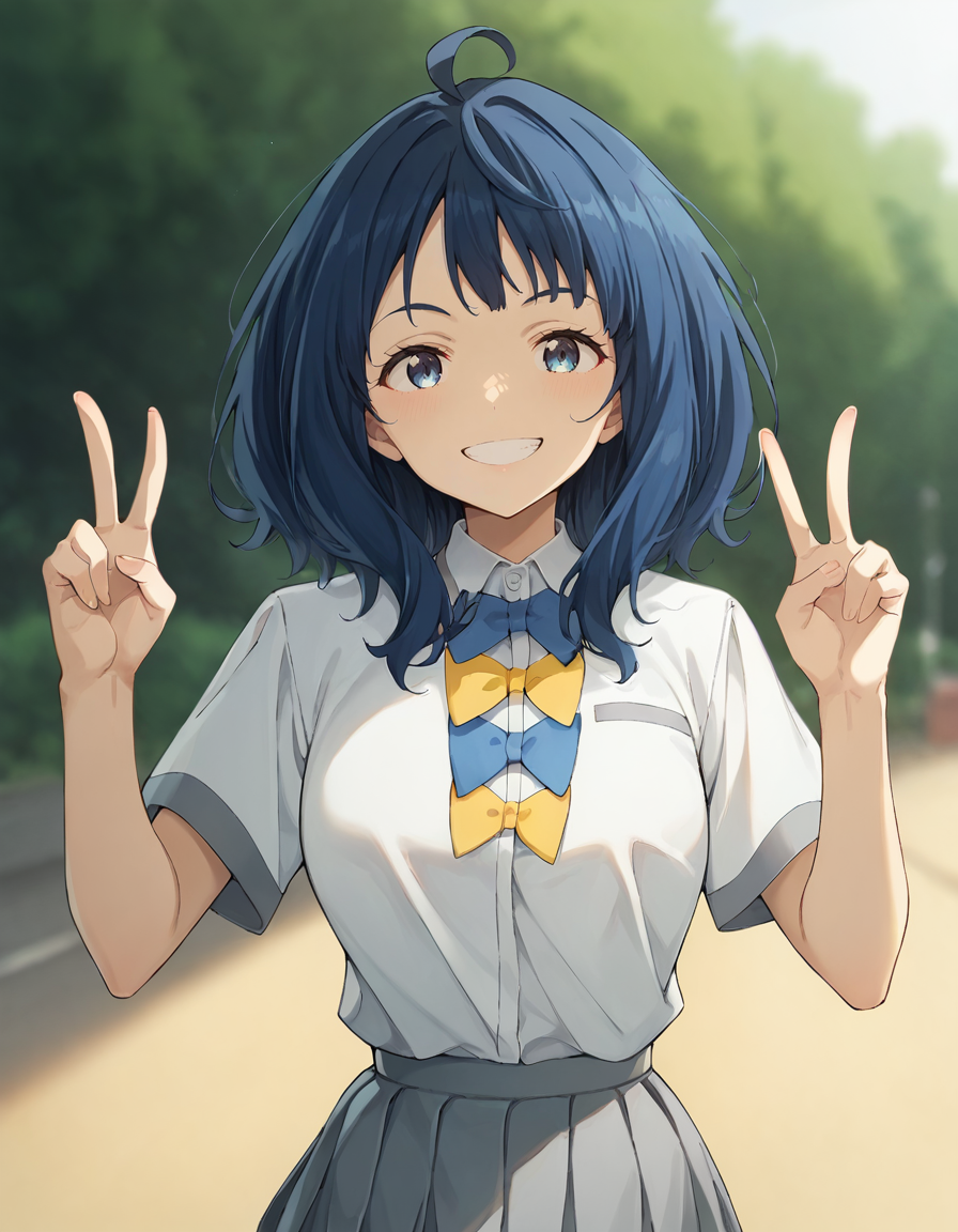 <lora:anna_yanami-makeine_s1-ixl-anime-soralz:1>, anna yanami (makeine), 蓝色头发,中长发,呆毛,蓝眼睛,马尾,黄色发圈