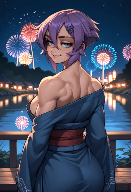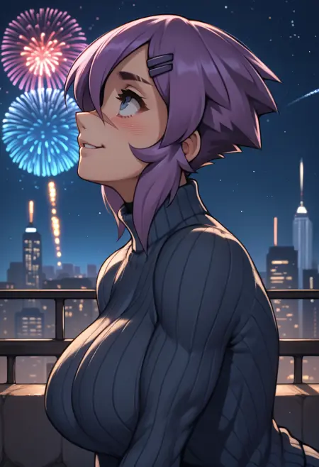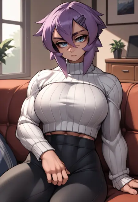 始终需要:"mayanew, blue eyes, purple hair, short hair, hairclip, nose scar, eyebrow cut, large breasts, muscular female"。