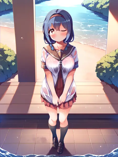 후루타니 히마와리, 파란 머리, 갈색 눈, 머리끈, 낮은 쌍단꼬리