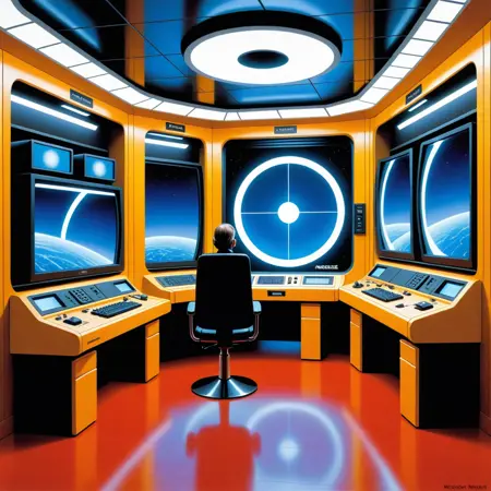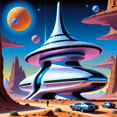 • Sleek, futuristic structures with a touch of retro-futurism.