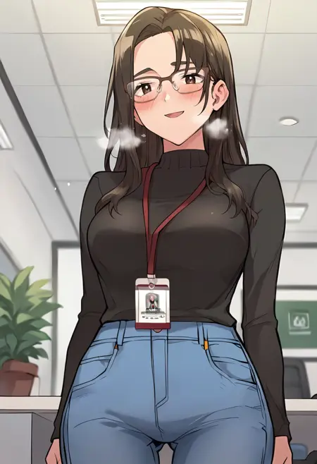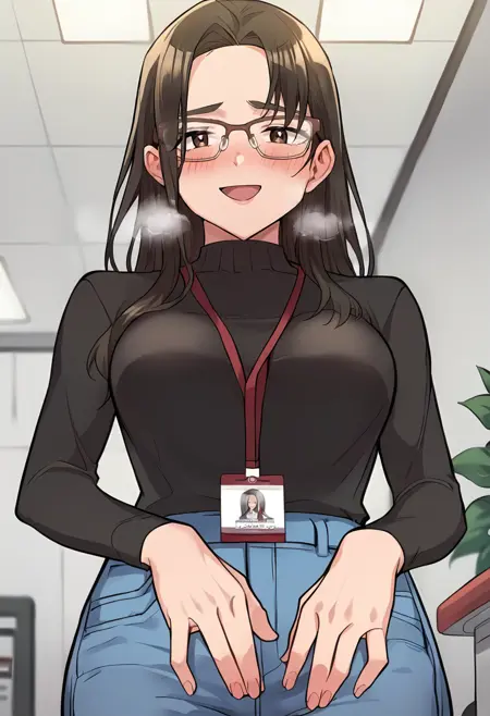 masterpiece, absurdres, newest, 1girl, c-yeon, long hair, black hair, semi-rimless eyewear, large breasts, mature female, black turtleneck sweater, lanyard, id card, jeans, indoors, day, dramatic lighting, looking at viewer, dutch angle,