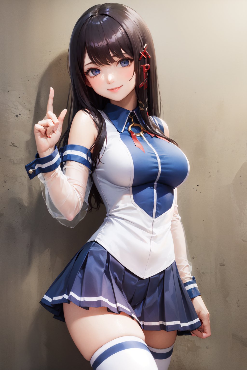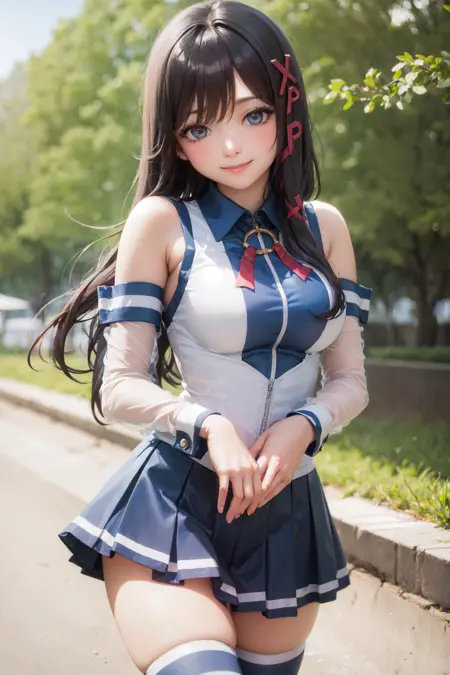 默认服装: 无袖上衣, 蓝色裙子, 高筒袜