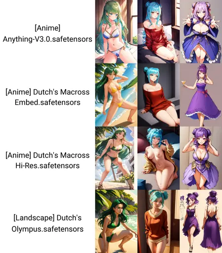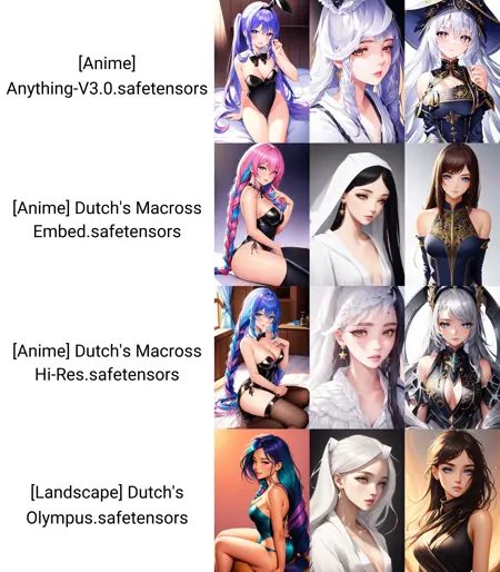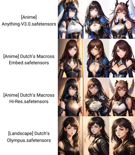 Macross Anime Ultimate:无需再使用 Macross 嵌入或 Hi-Res 模式!如今您可以直接切换至 Macross Ultimate,它集成了此前两个模型的所有功能!可生成各种风格的精彩动漫角色。此模型极为强大,若搭配 Remacri 放大器 使用(将 Remacri 放入 stable-diffusion-webui\models\ESRGAN 文件夹并重启 WebUI),效果更佳!