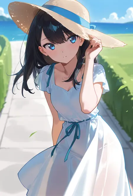青い目、黒髪、長い髪、ポニーテール、髪リボン、