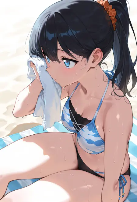 アニマルプリント、サイドタイのビキニ下、黒いビキニ、青いビキニ、白いビキニ、レイヤードビキニ、マッチしないビキニ、
