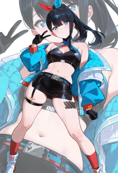 가슴 노출 디자인, 십자형 헬터, 어깨 노출, 오프숄더, 다색 조끼, 파란 조끼, 흰 조끼, 오픈 조끼, 검은 장갑, 벨트, 미크로스커트, 연필 스커트, 허벅지 스트랩, 스킨디덴테이션, 다리 문신, 빨간 양말, 흰 신발,